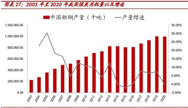 我國鋼鐵鐵行業(yè)碳排放量占全國碳排放總量的 15%,是碳排放最高的制造業(yè)。粗鋼作為傳統(tǒng)鋼煉產(chǎn)能主體,在我國產(chǎn)量居高不下,我國粗鋼產(chǎn) 量從 1949 年的 15.6 萬噸,僅占全球產(chǎn)量的 0.1%,而 2020 年我國粗鋼 產(chǎn)量為 10.53 億噸,占比全球 53.3%。從增幅方面來開17 年來我國粗 鋼產(chǎn)量增速已經(jīng)開始走低,為后期粗鋼等低質(zhì)高碳排鋼材的退出作出鋪 墊,但短期粗鋼等仍是我國鋼鐵行業(yè)產(chǎn)能主流。