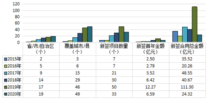 2020年,龍馬環(huán)衛(wèi)新增中標(biāo)環(huán)衛(wèi)服務(wù)項目 33 個,新簽合同年化金額 6.59 億元,同比下降 46.29%,新簽合同總金額 24.32 億元,同比下降 78.15%。