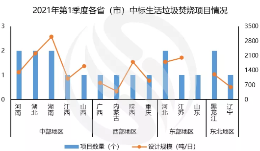 具體看,2021年第1季度,中部地區(qū)成交生活垃圾焚燒項目最多,共計8個,新增日處理能力9100噸/日,其中:河南、湖北、湖南各釋放2各項目,江西和山西各釋放1個項目;其次西部地區(qū)和東部地區(qū),各成交4個焚燒項目,新增日處理能力分別為3900噸/日和3800噸/日;東北地區(qū)釋放3個項目,新增日處理能力1800噸/日。