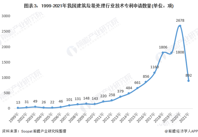據(jù)前瞻在專利信息服務(wù)平臺(tái)Soopat統(tǒng)計(jì), 2020年為2678項(xiàng),截至2021年4月,我國(guó)建筑垃圾處理行業(yè)技術(shù)專利申請(qǐng)數(shù)量共892件。