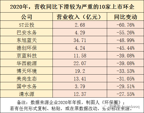 就營收增速而言,2020年,111家環(huán)保上市企業(yè)營收增速30%以上的,只有為數(shù)不多的10家。(如圖五所示)2019年這個數(shù)字還是23家,同比下降了56%。城投控股、德林海、雅居樂(環(huán)保)、城發(fā)環(huán)境、旺能環(huán)境、中環(huán)環(huán)保、高能環(huán)境、綠茵生態(tài)、三峰環(huán)境等企業(yè)都在高增長之列,而且這些企業(yè)從事業(yè)務(wù)大都與固廢相關(guān)。雅居樂不得不提。作為房企跨界入局環(huán)保的典范,旗下的環(huán)保集團,2020年面對來勢洶洶的疫情,即便身處競爭較為激烈,處理費大不如從前的危廢處置行業(yè),2020全年營收及毛利依然實現(xiàn)高速增長,值得點贊。高能環(huán)境非常優(yōu)秀,作為業(yè)內(nèi)20強為數(shù)不多上市民企,即未被產(chǎn)業(yè)寒冬和疫情的危機形勢打倒,還能從一批國資、央企中廝殺成功上位,自2014年上市以來,連續(xù)6年營收保持30%以上的增長。同樣還有低調(diào)行事的偉明環(huán)保,不僅資產(chǎn)負債率在行業(yè)內(nèi)處于較低水平(多數(shù)垃圾焚燒投資運營企業(yè)資產(chǎn)負債率60%-75%,而偉明環(huán)保今年一季度資產(chǎn)負債率只有47.5%),而且自2011年上市以來,凈利潤已由2011年的6973萬元攀升至12.57億元,歸母凈利潤連續(xù)9連增,復(fù)合增長率達到37.89%,遠高于同行水平。圖五:營收增幅30%+的10家上市環(huán)企相比上述企業(yè)的出彩表現(xiàn),接下來圖六表格中的ST云投、巴安水務(wù)、東旭藍天、華西能源、國中水務(wù)、清水源等10家上市環(huán)企的表現(xiàn)則不盡如意,2020年營業(yè)收入下滑較為嚴重,降幅最大的前三分別是ST云投、巴安水務(wù)、東旭藍天。圖六:營收同比下滑較為嚴重的10家上市環(huán)企凈利潤榜:半數(shù)位于億元以下,東方園林等增收不盈利