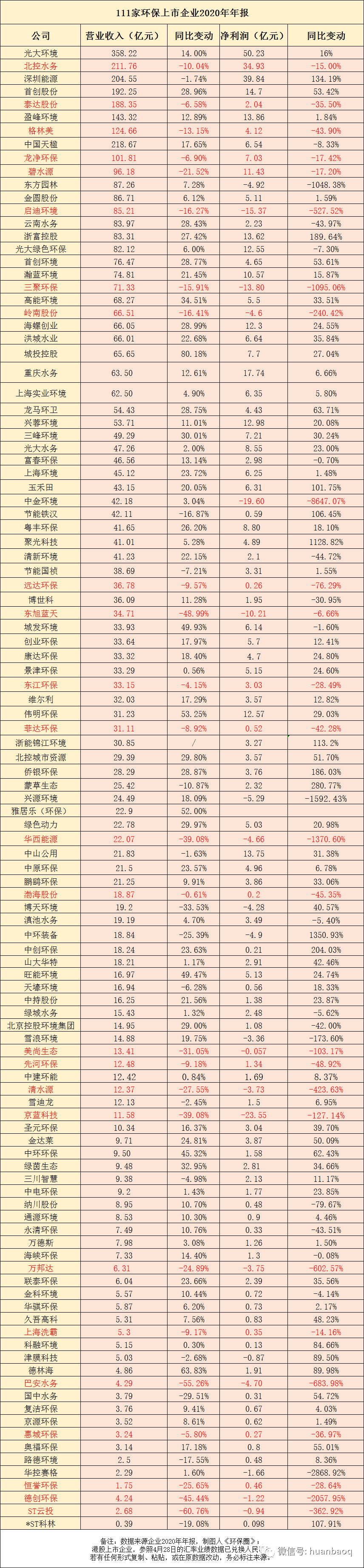 早在3月初,《環(huán)保圈》就已經(jīng)對55家環(huán)保上市企業(yè)的2020年業(yè)績預(yù)告進行了統(tǒng)計分析,結(jié)果發(fā)現(xiàn),55家企業(yè)中,有6成企業(yè)2020年歸母凈利潤實現(xiàn)正增長,4成企業(yè)表現(xiàn)不理想,歸母凈利潤負增長,甚至虧損。如果將55家環(huán)保上市企業(yè)范圍擴大2倍,增加到111家,總體情況是否會發(fā)生變化呢?據(jù)《環(huán)保圈》繼續(xù)跟蹤統(tǒng)計,截止到5月6日,A股/港股已有111家環(huán)保上市企業(yè)如期完成了2020年年報的披露工作(業(yè)績?nèi)珗D附文末),這些上市企業(yè)業(yè)務(wù)涉及環(huán)境監(jiān)測、生態(tài)修復(fù)、垃圾焚燒、環(huán)衛(wèi)、危險廢物、污水處理、供水等各個環(huán)保細分板塊,基本可以說明環(huán)保行業(yè)的整體情況。總體來看,111家上市環(huán)企中,約有6成企業(yè)2020年營業(yè)收入和歸母凈利潤均實現(xiàn)正向增長,4成的企業(yè)要么是營收下滑,要么是歸母凈利潤虧損。圖一:111家環(huán)保上市企業(yè),2020年凈利潤出現(xiàn)下滑/虧損占40%進一步觀察,營收和凈利潤表現(xiàn)均差的26家上市環(huán)企,不乏有排名非??壳暗募毞诸I(lǐng)域的龍頭,如北控水務(wù)、格林美、碧水源、啟迪環(huán)境、東江環(huán)保等。去年業(yè)績罕見出現(xiàn)大“變臉”,足以說明了2020年,在國內(nèi)外疫情的沖擊下,即便是細分領(lǐng)域的優(yōu)秀老兵,也有“馬失前蹄”的時候,好的不好,差的更差,掘金綠水青山比想象中的要難(如圖二所示)!圖二:2020年,營收和凈利潤均下滑/虧損的26家環(huán)保上市企業(yè)營收榜:光大環(huán)境穩(wěn)居第一,百億企業(yè)3家“掉隊”