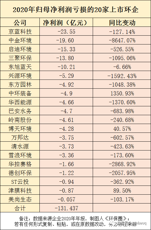 在外界宏觀條件不利、疫情生死攸關(guān)的2020年,仍有一些出類拔萃的上市環(huán)企脫穎出來,從凈利潤增速來看,2020年增速較快TOP10上市環(huán)企非常有看點(如圖八所示)。既有以買賣股權(quán)實現(xiàn)業(yè)績騰飛的聚光科技,也有前幾年負面纏身,疫情之下實現(xiàn)翻盤的中創(chuàng)環(huán)保和淪為*ST科林,還有被PPP拖累,引國資混改的蒙草生態(tài)和節(jié)能鐵漢,以及受疫情影響較小一線固廢名企,如僑銀環(huán)保、玉禾田、浙能錦江環(huán)境、玉禾田、深圳能源等。圖八:2020年環(huán)保上市企業(yè)凈利潤增速較快TOP10首先,凈利潤增幅最大當(dāng)屬聚光科技。2020年歸母凈利潤實現(xiàn)4.89億元,同比增長了1128.82%,主要原因是公司將持有的上海安譜實驗公司25.18%股權(quán),擬以3.6億元價格轉(zhuǎn)讓給廣州德福、杭州青丘。其次是被PPP拖累,遭遇生死劫的蒙草生態(tài)。據(jù)悉,蒙草生態(tài)業(yè)績實現(xiàn)大幅增長得益于旗下秦草、藏草、新草等子公司的運營良好,鞏固其核心競爭力。其中,秦草經(jīng)過激烈競標,在眾多國內(nèi)外知名企業(yè)中勝出,拿下22億元EPC總承包合同,還有子公司快樂小草的足球場建設(shè)、走路草坪等業(yè)務(wù)業(yè)發(fā)展迅猛。還有,連虧2年,終于在2020成功扭虧為盈的中創(chuàng)環(huán)保(原三維絲)也值得一提。有分析人士認為,隨著原股東“淡出”,上海中創(chuàng)控股后,雖然從經(jīng)營數(shù)據(jù)上看,已有好轉(zhuǎn)趨勢,但要消除持續(xù)多年的負面影響還需觀察。最后是受疫情影響較小,又趕上垃圾分類、市政環(huán)衛(wèi)好時候的僑銀環(huán)保。2020年營收同比增長28.87%,凈利潤大增186.03%,主要是去年疫情免收增值稅、環(huán)衛(wèi)運營項目充沛等影響。接下來,這些企業(yè)2020年經(jīng)營狀況不免有點慘淡了,真可謂旱的旱死,澇的澇死。在111家上市環(huán)企中,2020年歸母凈利潤同比下滑的有26家,虧損有20家(如圖九所示),累計虧損金額高達132億元,京藍科技、中金環(huán)境、啟迪環(huán)境、三聚環(huán)保、東旭藍天都虧損了10億元以上。可喜的是,博天環(huán)境雖然繼續(xù)虧損,但虧損幅度收窄,相較于上年同期增長了40.57%。圖九:2020年歸母凈利潤實現(xiàn)虧損的20家上市環(huán)企如果要在這20家虧損企業(yè)中,找到2020上市環(huán)企虧損幅度最大的“十大虧損王”,如圖十所示中金環(huán)境、德創(chuàng)環(huán)保、華控賽格、興源環(huán)境、三聚環(huán)保、東方園林、巴安水務(wù)、萬邦達、啟迪環(huán)境、清水源都“榜上有名”。圖十:2020上市環(huán)企虧損幅度最大的“十大虧損王”中金環(huán)境成為當(dāng)之無愧的“虧損王”,2020年凈虧損高達19.6億元,相較于2019年的2292萬元,下降了8647.07%,驚呆業(yè)界。據(jù)筆者觀察,其實從2018年中金環(huán)境就已經(jīng)開始走下坡路了。2018年,凈利潤4.3億元,比上年下滑27.17%,2019業(yè)績繼續(xù)下滑,凈利潤僅為2292萬,到了2020年,經(jīng)營更加惡化,虧損了19.6億元。巨虧原因主要受新冠肺炎疫情及市場環(huán)境影響,子公司金泰萊、中咨華宇無法完成業(yè)績承諾,面臨巨額資產(chǎn)減值問題,預(yù)計計提商譽減值金額共計17.50億元至19億元之間。同樣經(jīng)營惡化,由盈轉(zhuǎn)虧還有華控賽格、德創(chuàng)環(huán)保,這兩家企業(yè)2019年同期凈利潤分別為594萬元、625萬,到了2020年,受疫情及全球經(jīng)濟衰退的影響,環(huán)保工程業(yè)務(wù)出現(xiàn)下滑,凈利潤分別虧損約1.66億元、1.22億元,同比下降2868.92%、2057.95%。縱觀這些虧損上市環(huán)企,雖然每家企業(yè)跌倒原因不同,但年報都不約而同提及幾個方面:國內(nèi)外新冠疫情導(dǎo)致復(fù)工復(fù)產(chǎn)、項目結(jié)算周期延遲和政府支付能力下滑;環(huán)保市場競爭加劇,導(dǎo)致項目毛利減少;部分環(huán)保細分領(lǐng)域,僧多肉少,市場趨于飽和。老舊項目回款不暢,應(yīng)收賬款居高不下,導(dǎo)致壞賬減值計提損失。如東江環(huán)保年報提到,營收下滑主要系疫情影響,工業(yè)企業(yè)開工減少,導(dǎo)致危廢處理量下降;且隨著新增產(chǎn)能陸續(xù)投產(chǎn),行業(yè)競爭日趨激烈,市場收運和處理費價格有所下滑。再如中環(huán)裝備年報提到,面對傳統(tǒng)煙氣治理市場飽和,獲取大氣減排訂單變得越來越難,對公司業(yè)績造成不小的影響。無論如何,凡此過往皆為序章,最難的2020年都已過去了,面向“十四五”,所有企業(yè)都將面臨新的機遇和挑戰(zhàn)。業(yè)績好的2021年再接再厲,續(xù)寫輝煌;業(yè)績差的則要再接再厲,打個漂亮的翻身仗。未來,《環(huán)保圈》將持續(xù)關(guān)注業(yè)內(nèi)企業(yè)動態(tài),觀察行業(yè)大勢,為讀者奉獻更多精彩的分析。