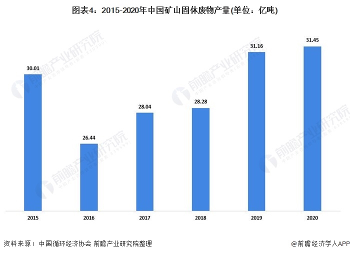 2020年中國(guó)礦上固體廢物產(chǎn)量為31.45億噸,2015-2020年產(chǎn)量的復(fù)合年增長(zhǎng)率為0.9%。整體來(lái)看,近年來(lái)礦上固體廢物產(chǎn)量基本保持穩(wěn)定。