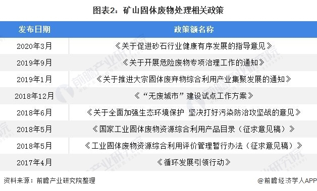 為了消除礦山固體廢物導(dǎo)致的污染,政府現(xiàn)積極推動(dòng)綜合利用礦山固體廢物。固廢處理行業(yè)作為保護(hù)生態(tài)平衡、實(shí)現(xiàn)可循環(huán)經(jīng)濟(jì)的重要推動(dòng)力量,與之相關(guān)的國(guó)家政策頻頻發(fā)布。