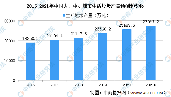我國是人口大國,也是垃圾產(chǎn)生大國,且隨著經(jīng)濟穩(wěn)步發(fā)展、民眾生活消費水平、城鎮(zhèn)化率不斷提高,生活垃圾產(chǎn)生量持續(xù)走高。2016年我國大、中城市生活垃圾產(chǎn)生量18850.5萬噸,2019年生活垃圾產(chǎn)生量增至23560.2萬噸。預(yù)計2021年我國生活垃圾產(chǎn)量27097.2萬噸。