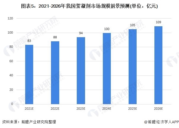在我國水資源短缺的同時,我國水環(huán)境污染狀況日趨嚴重,目前全國約有1/3的工業(yè)廢水和4/5的生活廢水未經(jīng)處理就直接排入江、河、湖、海,使水環(huán)境遭到嚴重污染,直接影響到人民生活和經(jīng)濟的發(fā)展。在節(jié)約水資源和防治水污染背景下,絮凝劑市場具有著巨大的發(fā)展空間,預(yù)計到2026年我國我國絮凝劑市場規(guī)模將持續(xù)增長到109億元。