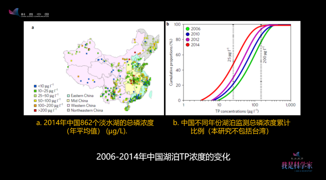 這個中國地圖表明我們有很多的污染物沒有處理好,就會進入到湖泊里面。這個地方講的是磷會到我們的湖泊里。如果沒有處理好,氮也會到湖泊里去,也會到各種水體里去。