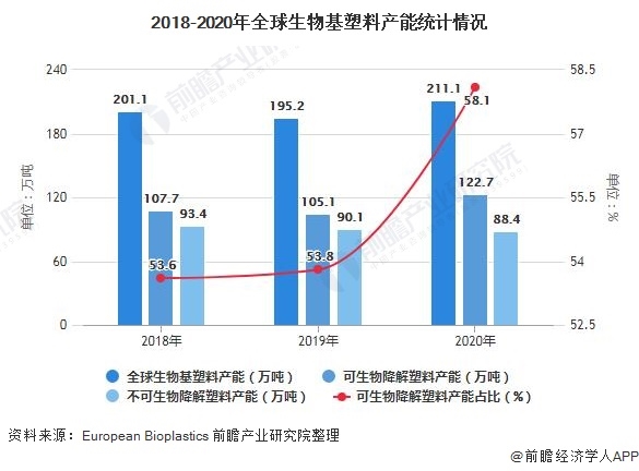據(jù)European Bioplastics(歐洲生物塑料協(xié)會)于發(fā)布的最新數(shù)據(jù)顯示,全球生物基塑料約占每年生產(chǎn)的塑料中的1%。2020年,全球生物基塑料產(chǎn)能達211.1萬噸,其中可生物降解塑料的產(chǎn)能為122.7萬噸,不可生物降解產(chǎn)能為88.4萬噸。