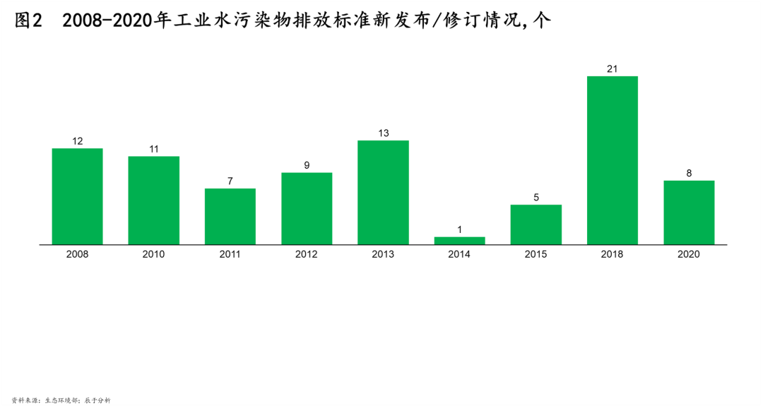 二是排放標準趨嚴,自行處理難度加大。中央環(huán)保督察已完成全覆蓋,最新的第二輪、第三批下沉工作任務也已基本完成,8個中央生態(tài)環(huán)境保護督察組于2021年4月6日至4月9日陸續(xù)進駐8個省(區(qū))開展督察。此外,我國自2008年起持續(xù)發(fā)布及修訂了包括造紙、化工等行業(yè)在內的水污染物排放標準,不斷收緊水污染物排放的限值(如圖2)。過去,部分企業(yè)內部的廢水處理設施處于非正常運行狀態(tài),開工率低、處理質量低,不利于達標排放,第三方運營的重要性日漸凸顯。