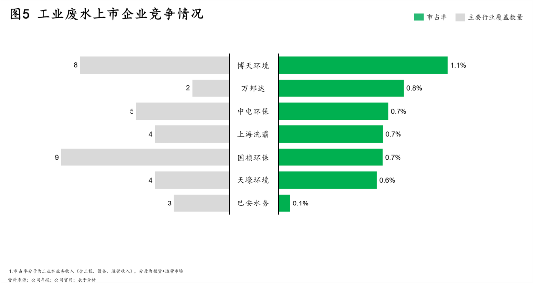 不同行業(yè)廢水的處理方式大不相同,且存在較高的技術壁壘,工業(yè)廢水治理企業(yè)通常只能專注于某一個或某幾個細分領域,導致當前行業(yè)競爭格局分散,頭部企業(yè)市場占有率偏低,“小而散”是主流狀態(tài)(如圖5)。
