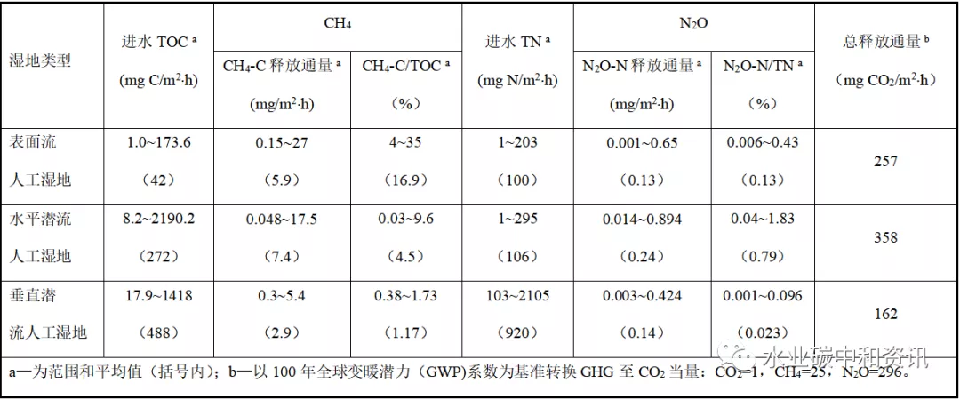 將CH4和N2O折算成CO2當(dāng)量后得出的總釋放通量為:水平潛流(358 mg CO2/m2×h)>表面流(257mg CO2/m2×h)>垂直流(162 mg CO2/m2×h)。可見(jiàn),垂直流人工濕地的GHG釋放通量最小。其實(shí),垂直流濕地占地面積也最小,這更加凸顯了其GHG釋放總量明顯小于水平流和表面流濕地的特征。另外,表1還顯示,不同人工濕地中CH4都是主要GHG類(lèi)型,對(duì)總釋放量貢獻(xiàn)率均>60%。因此,控制CH4釋放應(yīng)成為人工濕地減少GHG排放的關(guān)鍵。