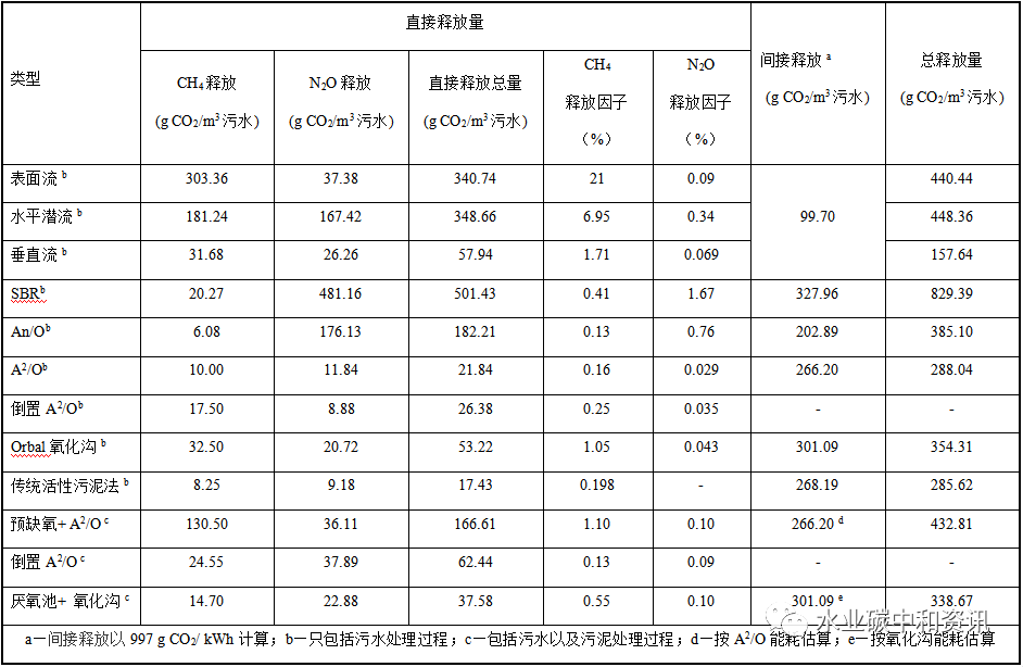 除直接釋放外,污水處理過(guò)程中GHG釋放還包括間接釋放(能源/藥耗等)。人工濕地運(yùn)行能耗一般小于0.1 kWh/m3(取0.1),而An/O、A2/O、SBR、氧化溝、傳統(tǒng)活性污泥法等活性污泥工藝平均能耗分別為0.283、0.267、0.336 、0.302和0.269 kWh/m3 ??梢?jiàn),人工濕地間接釋放量(99.7 g CO2/m3)遠(yuǎn)遠(yuǎn)小于傳統(tǒng)工藝的最小間接釋放量(An/O工藝:202.89 g CO2/m3)。即便如此,表面流和水平潛流人工濕地的GHG總釋放量(直接+間接)仍與傳統(tǒng)活性污泥法旗鼓相當(dāng),甚至更高。唯有垂直流人工濕地GHG總釋放量遠(yuǎn)低于所有活性污泥工藝。因此,在建設(shè)成本及運(yùn)行狀況允許的情況下應(yīng)盡可能選用垂直流人工濕地