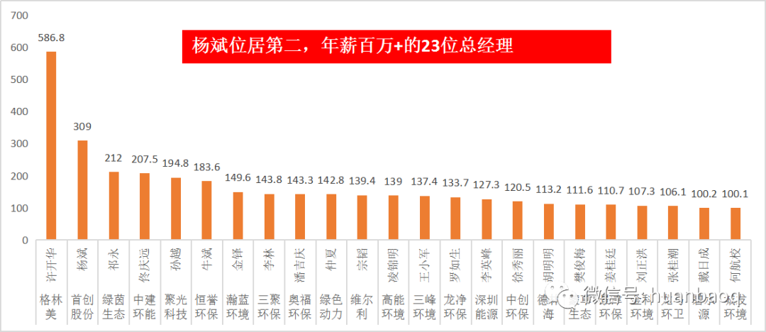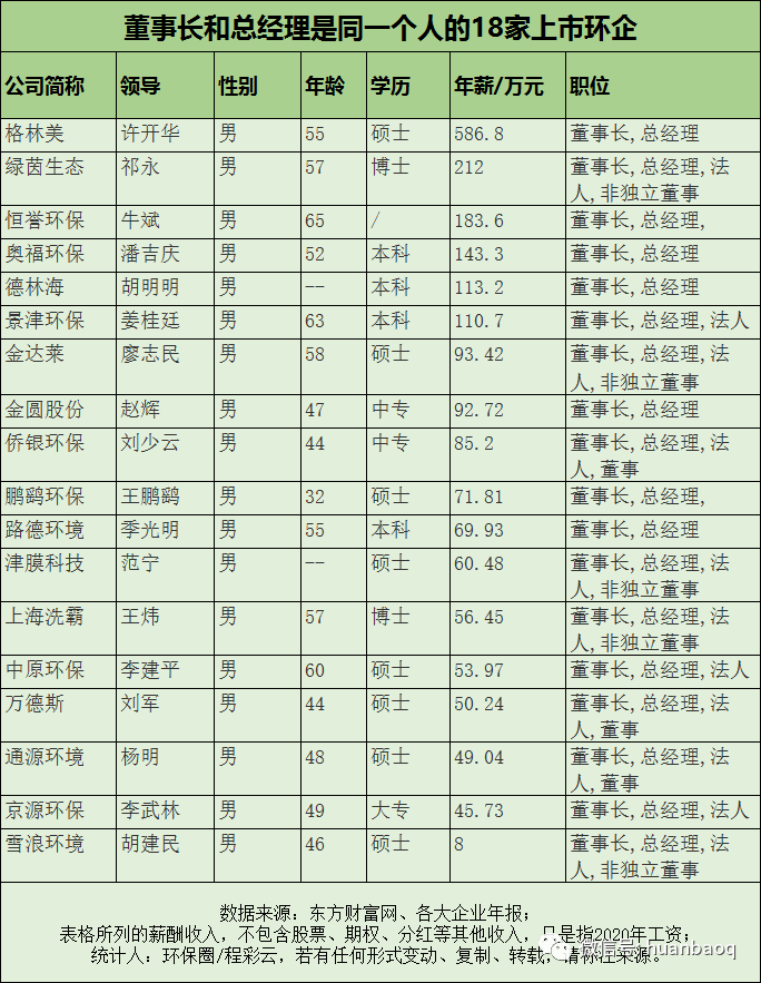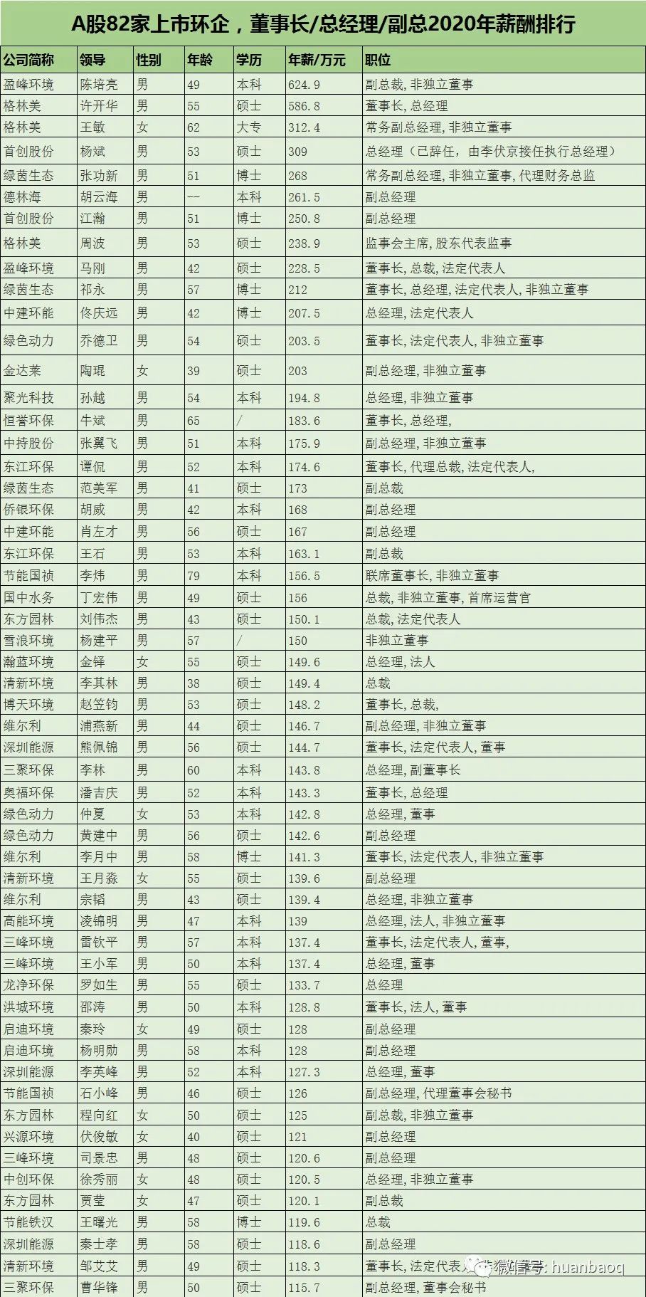 看完了整體的情況,再來看看董事長(zhǎng)這個(gè)維度的排名。在“A股上市環(huán)企董事長(zhǎng)年薪TOP20榜單”中,格林美的許開華以587萬元高居榜首,比第二名(盈峰環(huán)境董事長(zhǎng)馬剛)和第三名(綠茵生態(tài)祁永)的總和還要高出150萬元。(如圖三所示)。圖三:A股82家上市環(huán)企,董事長(zhǎng)年薪排名前TOP20也有的老板不舍得為自己開工資,在圖四“董事長(zhǎng)年薪倒數(shù)TOP20榜單”中,2020年年薪最低的董事長(zhǎng)只有2.5萬元,月平均工資約2000元,這水平都抵不上一位普通的職員。圖四:A股82家上市環(huán)企,董事長(zhǎng)年薪倒數(shù)TOP20這位拿著2.5萬元年薪的董事長(zhǎng),就是富春環(huán)保董事長(zhǎng)萬嬌。公開資料顯示,富春環(huán)保董事長(zhǎng)萬嬌是一位1988年出生,年僅33歲的女掌門人,但其掌門的富春環(huán)保,市值則已高達(dá)56億元。眾所周知,富春環(huán)保是一家剛剛經(jīng)歷了“混改”的企業(yè),去年南昌市國(guó)資委剛剛?cè)胫?,萬嬌則是由南昌國(guó)資提名,代替原董事長(zhǎng)的人選。事實(shí)上,在統(tǒng)計(jì)董事長(zhǎng)薪資收入時(shí),我們發(fā)現(xiàn)了一個(gè)有趣的現(xiàn)象——好多上市環(huán)企,副總、總經(jīng)理的年薪都要高于董事長(zhǎng)!甚至有的董事長(zhǎng)(如首創(chuàng)股份劉永政),都沒有在公司領(lǐng)取任何報(bào)酬!不過,這些董事長(zhǎng)收入較低的企業(yè),很多還都是業(yè)績(jī)表現(xiàn)不錯(cuò)的企業(yè),比如瀚藍(lán)環(huán)境、中國(guó)天楹、上海環(huán)境、富春環(huán)保等。或許,董事長(zhǎng)情愿“讓賢”,讓更專業(yè)的人才來管理企業(yè),并給予更高的報(bào)酬,也是這些企業(yè)發(fā)展更好的原因之一吧。總經(jīng)理年薪排行:首創(chuàng)股份位居第二看完董事長(zhǎng)的,再來看總經(jīng)理的。首先,很多環(huán)保公司,董事長(zhǎng)和總經(jīng)理都是一人兼任,如格林美許開華、僑銀環(huán)保劉少云、景津環(huán)保姜桂廷、金達(dá)萊廖志民、通源環(huán)保楊明、恒譽(yù)環(huán)保牛斌、奧福環(huán)保潘吉慶等(如圖五所示)。同時(shí),這些董事長(zhǎng)兼總經(jīng)理幾乎都是清一色的男性。年紀(jì)最大是去年科創(chuàng)板上市的恒譽(yù)環(huán)保創(chuàng)始人牛斌,今年65歲;最小的當(dāng)數(shù)“環(huán)二代”,子承父業(yè)的王鵬鷂,今年32歲。圖五:董事長(zhǎng)和總經(jīng)理是同一個(gè)人的18家上市環(huán)企從薪酬來看,在60位上市環(huán)企總經(jīng)理中,年薪達(dá)到“百萬級(jí)”以上的有23位,約占40%(如圖六所示)。其中,有不少業(yè)內(nèi)熟知的大咖,如首創(chuàng)股份原總經(jīng)理?xiàng)畋螅晷?09萬元)、瀚藍(lán)環(huán)境金鐸(年薪150萬元)、高能環(huán)境凌錦明(年薪139萬元)、三峰環(huán)境王小軍(年薪137.4萬元),以及碧水源戴日成(年薪100萬元)等。總體來看,總經(jīng)理這個(gè)維度的收入狀況還是不錯(cuò)的,“百萬級(jí)”的占比較高,很多甚至比董事長(zhǎng)年薪還要高,也體現(xiàn)了職業(yè)經(jīng)理人的價(jià)值。副總年薪排行: