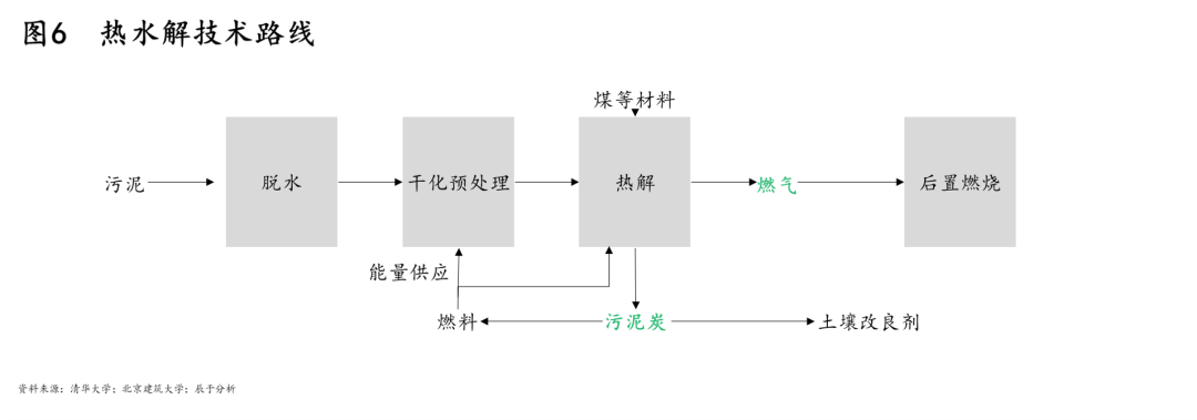 而在資源回收上,相比好氧堆肥,干化焚燒及熱水解則是更好的資源化方式,值得重點關(guān)注。干化焚燒的技術(shù)路線如圖5所示,作為快捷、徹底實現(xiàn)污泥減量化、穩(wěn)定化、無害化的最終處置技術(shù),干化焚燒后的資源化利用產(chǎn)品也更易走通;熱水解的技術(shù)路線如圖6所示,其生產(chǎn)過程清潔化,生成的污泥炭資源多樣化。
