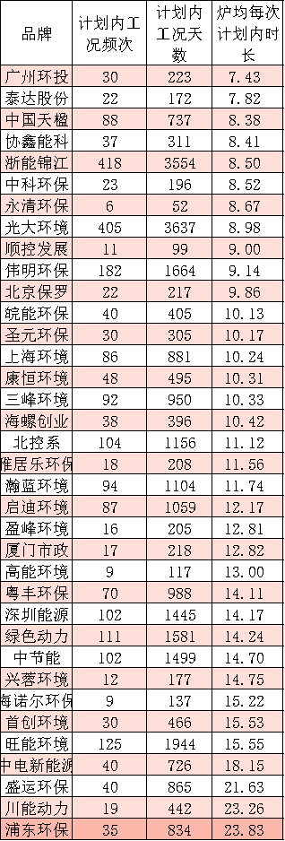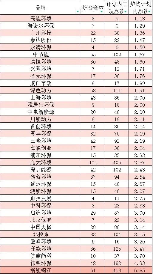 康恒環(huán)境、浦東環(huán)保、深圳能源、廣州環(huán)投、上海環(huán)境、瀚藍環(huán)境、中節(jié)能、光大環(huán)境、三峰環(huán)境、中科環(huán)保、海螺創(chuàng)業(yè)、首創(chuàng)環(huán)境等12家國內垃圾焚燒頭部和知名企業(yè),平均爐均總停爐頻次則小于或等于4次。