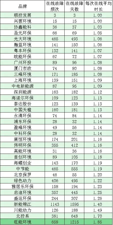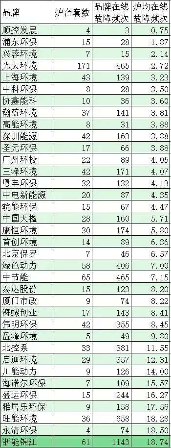 浦東環(huán)保、永清環(huán)保兩家品牌企業(yè),旗下每臺爐平均非停頻次為1。