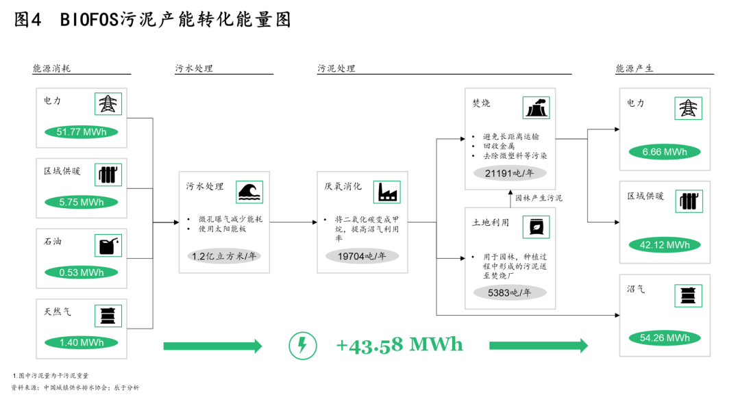 其二,30·60雙碳目標(biāo)提出后,未來污泥處理處置將以節(jié)能降耗及能源資源回收為目標(biāo),這對污泥處理提出了更為清晰的技術(shù)路徑方向。例如在能源回收上,厭氧消化是優(yōu)選途徑,如丹麥污水廠BIOFOS通過污泥消化產(chǎn)能實(shí)現(xiàn)能量盈余(見圖4)。