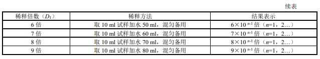 用量筒(6.6)取第 n−1 次初級稀釋的試料,按照表 1 的稀釋方法由小到大逐級按自然倍數(shù)進(jìn)行稀 釋,每稀釋 1 次,混勻后按目視比色方法(8.3)觀察,直到剛好與水(5)無法區(qū)別時停止稀釋,記錄稀釋倍數(shù) D1。