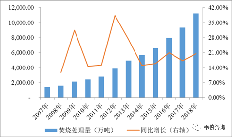 隨著城市生活垃圾“減量化、資源化、無害化”處理需求的日益增長,我國垃圾焚燒處理近年來發(fā)展迅速。據(jù)住房和城鄉(xiāng)建設(shè)部統(tǒng)計(jì):2007年至2018年,我國城市生活垃圾焚燒廠年實(shí)際處理量從1,446萬噸增長到11,226萬噸,復(fù)合增長率達(dá)20.48%。