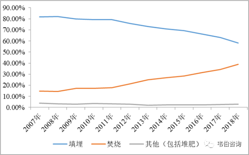 圖表5:2007年至2018年我國城市生活垃圾無害化處理方式占比變化情況