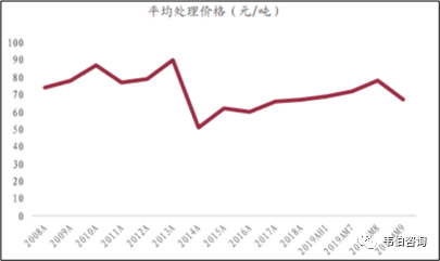圖表12:2008-2019年新增垃圾焚燒發(fā)電項(xiàng)目價格變化趨勢(元/噸)