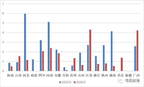 圖表15:截止2020年底和2030年底各省垃圾焚燒中長期規(guī)劃新增項(xiàng)目產(chǎn)能(萬噸/日)