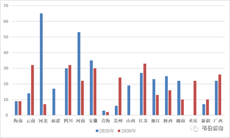 圖表14:截止2020年底和2030年底各省垃圾焚燒中長期規(guī)劃新增項(xiàng)目數(shù)量(個)
