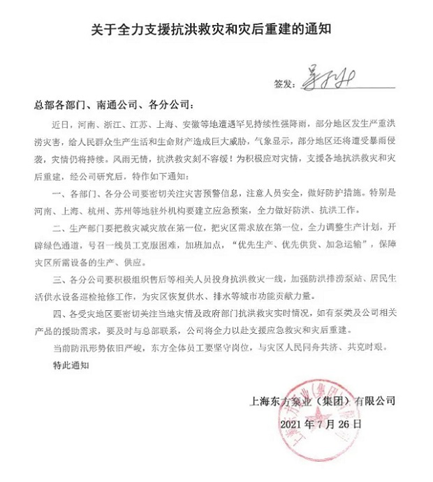 面對災(zāi)情,上海東方泵業(yè)(集團(tuán))有限公司董事長吳永旭先生第一時(shí)間提出要求:搶先救災(zāi)減災(zāi),全力調(diào)整生產(chǎn)計(jì)劃,開辟綠色通道,優(yōu)先保障災(zāi)區(qū)所需給排水設(shè)備的生產(chǎn)、供應(yīng);各分公司要組織人員積極投身抗洪救災(zāi)一線,加強(qiáng)防洪排澇泵站、居民生活供水設(shè)備巡檢搶修工作;各駐外機(jī)構(gòu)要積極聯(lián)系相關(guān)管理部門,了解災(zāi)區(qū)實(shí)際需求,只要災(zāi)區(qū)有需要,上海東方泵業(yè)(集團(tuán))有限公司一定全力以赴支援應(yīng)急救災(zāi)和災(zāi)后重建。