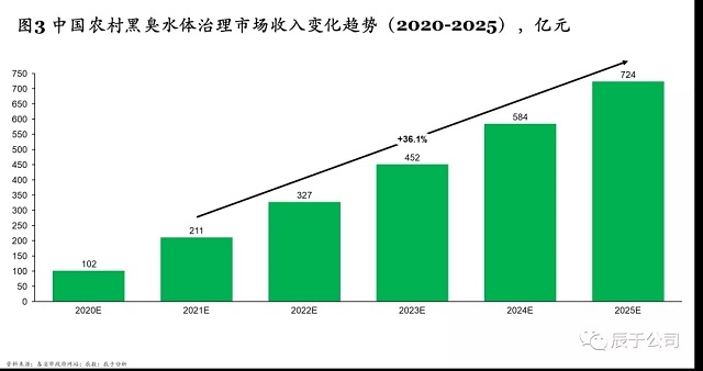 據(jù)辰于測算,如能按期達到上述目標,“十四五”期間我國農(nóng)村黑臭水體治理市場將保持36.1%的年復合增長,到2025年達到724億元的收入規(guī)模(見圖3)