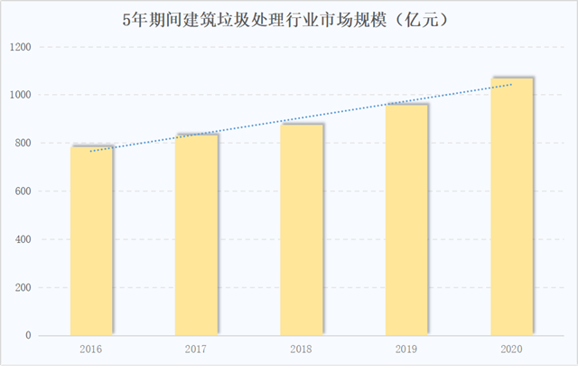 隨著建筑垃圾產量的提高,其處理市場也不斷擴大。顯而易見的是,近五年來的市場規(guī)模整體呈上升趨勢。2017年突破了800億元,2019年已經接近千億,2020年達到了1068.31億元。如果按此數據持續(xù)增長,到2021年,建筑垃圾市場規(guī)模有望達到1200億元。