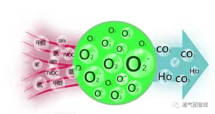 負離子與氣體分子(原子)發(fā)生非彈性碰撞,發(fā)生激發(fā)、離解、電離等一系列反應,使氣體處于活化狀態(tài)而產(chǎn)生的活性自由基以活化污染物分子,分子發(fā)生斷裂而被分解,最終可將惡臭氣體轉(zhuǎn)化為 CO2,H2O 等空氣中常態(tài)分子。