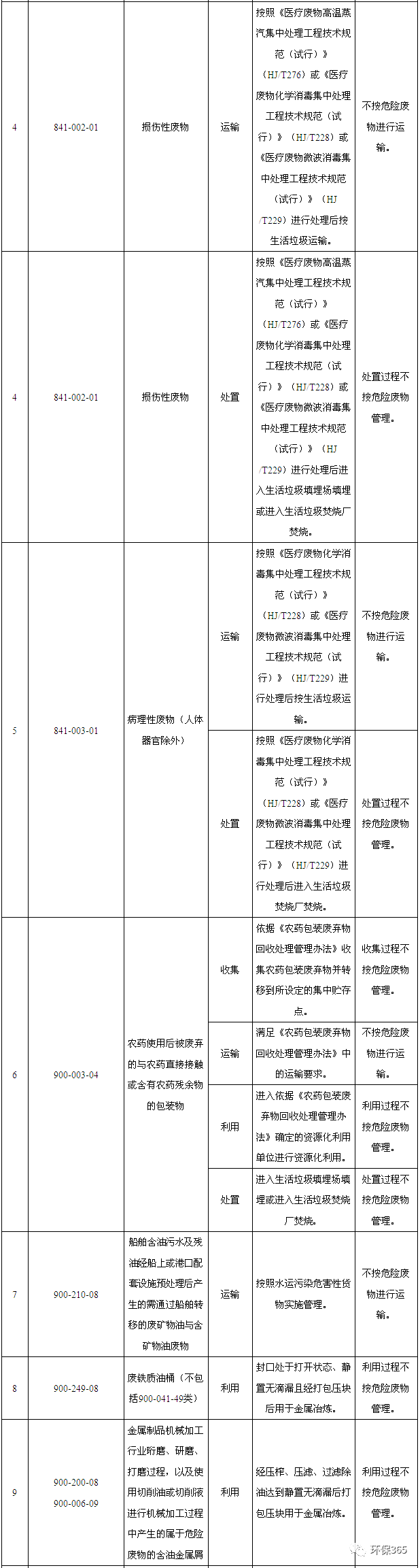 (1)家庭日常生活或者為日常生活提供服務(wù)的活動(dòng)中產(chǎn)生的廢藥品、廢殺蟲劑和消毒劑及其包裝物、廢油漆和溶劑及其包裝物、廢礦物油及其包裝物、廢膠片及廢像紙、廢熒光燈管、廢含汞溫度計(jì)、廢含汞血壓計(jì)、廢鉛蓄電池、廢鎳鎘電池和氧化汞電池以及電子類危險(xiǎn)廢物等未經(jīng)過(guò)集中收集的全部環(huán)節(jié)不按危險(xiǎn)廢物管理;按照各市、縣生活垃圾分類要求,納入生活垃圾分類收集體系進(jìn)行分類收集,且運(yùn)輸工具和暫存場(chǎng)所滿足分類收集體系要求的,從分類投放點(diǎn)收集轉(zhuǎn)移到所設(shè)定的集中貯存點(diǎn)的收集過(guò)程不按危險(xiǎn)廢物管理。(2)床位總數(shù)在19張以下(含19張)的醫(yī)療機(jī)構(gòu)產(chǎn)生的醫(yī)療廢物(重大傳染病疫情期間產(chǎn)生的醫(yī)療廢物除外)按《醫(yī)療衛(wèi)生機(jī)構(gòu)醫(yī)療廢物管理辦法》等規(guī)定進(jìn)行消毒和收集的,收集過(guò)程不按危險(xiǎn)廢物管理;轉(zhuǎn)運(yùn)車輛符合《醫(yī)療廢物轉(zhuǎn)運(yùn)車技術(shù)要求(試行)》(GB19217)要求的,不按危險(xiǎn)廢物進(jìn)行運(yùn)輸;重大傳染病疫情期間產(chǎn)生的醫(yī)療廢物,按事發(fā)地的縣級(jí)以上人民政府確定的處置方案進(jìn)行運(yùn)輸?shù)?,不按危險(xiǎn)廢物進(jìn)行運(yùn)輸;按事發(fā)地的縣級(jí)以上人民政府確定的處置方案進(jìn)行處置的,處置過(guò)程不按危險(xiǎn)廢物管理。(3)感染性廢物按照《醫(yī)療廢物高溫蒸汽集中處理工程技術(shù)規(guī)范(試行)》(HJ/T276)或《醫(yī)療廢物化學(xué)消毒集中處理工程技術(shù)規(guī)范(試行)》(HJ/T228)或《醫(yī)療廢物微波消毒集中處理工程技術(shù)規(guī)范(試行)》(HJ/T229)進(jìn)行處理后按生活垃圾運(yùn)輸?shù)?,不按危險(xiǎn)廢物進(jìn)行運(yùn)輸;按照《醫(yī)療廢物高溫蒸汽集中處理工程技術(shù)規(guī)范(試行)》(HJ/T276)或《醫(yī)療廢物化學(xué)消毒集中處理工程技術(shù)規(guī)范(試行)》(HJ/T228)或《醫(yī)療廢物微波消毒集中處理工程技術(shù)規(guī)范(試行)》(HJ/T229)進(jìn)行處理后進(jìn)入生活垃圾填埋場(chǎng)填埋或進(jìn)入生活垃圾焚燒廠焚燒的,處置過(guò)程不按危險(xiǎn)廢物管理。(4)損傷性廢物按照《醫(yī)療廢物高溫蒸汽集中處理工程技術(shù)規(guī)范(試行)》(HJ/T276)或《醫(yī)療廢物化學(xué)消毒集中處理工程技術(shù)規(guī)范(試行)》(HJ/T228)或《醫(yī)療廢物微波消毒集中處理工程技術(shù)規(guī)范(試行)》(HJ/T229)進(jìn)行處理后按生活垃圾運(yùn)輸?shù)?,不按危險(xiǎn)廢物進(jìn)行運(yùn)輸;按照《醫(yī)療廢物高溫蒸汽集中處理工程技術(shù)規(guī)范(試行)》(HJ/T276)或《醫(yī)療廢物化學(xué)消毒集中處理工程技術(shù)規(guī)范(試行)》(HJ/T228)或《醫(yī)療廢物微波消毒集中處理工程技術(shù)規(guī)范(試行)》(HJ/T229)進(jìn)行處理后進(jìn)入生活垃圾填埋場(chǎng)填埋或進(jìn)入生活垃圾焚燒廠焚燒的,處置過(guò)程不按危險(xiǎn)廢物管理。(5)病理性廢物(人體器官除外)按照《醫(yī)療廢物化學(xué)消毒集中處理工程技術(shù)規(guī)范(試行)》(HJ/T228)或《醫(yī)療廢物微波消毒集中處理工程技術(shù)規(guī)范(試行)》(HJ/T229)進(jìn)行處理后按生活垃圾運(yùn)輸?shù)?,不按危險(xiǎn)廢物進(jìn)行運(yùn)輸;按照《醫(yī)療廢物化學(xué)消毒集中處理工程技術(shù)規(guī)范(試行)》(HJ/T228)或《醫(yī)療廢物微波消毒集中處理工程技術(shù)規(guī)范(試行)》(HJ/T229)進(jìn)行處理后進(jìn)入生活垃圾焚燒廠焚燒的,處置過(guò)程不按危險(xiǎn)廢物管理。(6)農(nóng)藥使用后被廢棄的與農(nóng)藥直接接觸或含有農(nóng)藥殘余物的包裝物依據(jù)《農(nóng)藥包裝廢棄物回收處理管理辦法》收集并轉(zhuǎn)移到所設(shè)定的集中貯存點(diǎn)的,收集過(guò)程不按危險(xiǎn)廢物管理;滿足《農(nóng)藥包裝廢棄物回收處理管理辦法》中的運(yùn)輸要求的,不按危險(xiǎn)廢物進(jìn)行運(yùn)輸;進(jìn)入依據(jù)《農(nóng)藥包裝廢棄物回收處理管理辦法》確定的資源化利用單位進(jìn)行資源化利用的,利用過(guò)程不按危險(xiǎn)廢物管理;進(jìn)入生活垃圾填埋場(chǎng)填埋或進(jìn)入生活垃圾焚燒廠焚燒的,處置過(guò)程不按危險(xiǎn)廢物管理。(7)船舶含油污水及殘油經(jīng)船上或港口配套設(shè)施預(yù)處理后產(chǎn)生的需通過(guò)船舶轉(zhuǎn)移的廢礦物油與含礦物油廢物按照水運(yùn)污染危害性貨物實(shí)施管理的,不按危險(xiǎn)廢物進(jìn)行運(yùn)輸。(8)廢鐵質(zhì)油桶(不包括900-041-49類)封口處于打開狀態(tài)、靜置無(wú)滴漏且經(jīng)打包壓塊后用于金屬冶煉的,利用過(guò)程不按危險(xiǎn)廢物管理。(9)金屬制品機(jī)械加工行業(yè)珩磨、研磨、打磨過(guò)程,以及使用切削油或切削液進(jìn)行機(jī)械加工過(guò)程中產(chǎn)生的屬于危險(xiǎn)廢物的含油金屬屑經(jīng)壓榨、壓濾、過(guò)濾除油達(dá)到靜置無(wú)滴漏后打包壓塊用于金屬冶煉的,利用過(guò)程不按危險(xiǎn)廢物管理。(10)煤炭焦化、氣化及生產(chǎn)燃?xì)膺^(guò)程中產(chǎn)生的滿足《煤焦油標(biāo)準(zhǔn)》(YB/T5075)技術(shù)要求的高溫煤焦油作為原料深加工制取萘、洗油