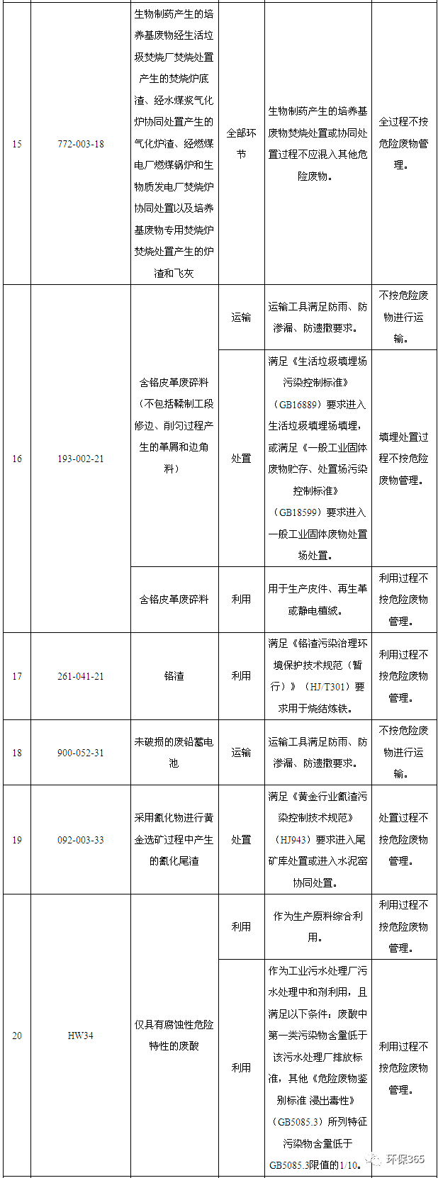 如:生活垃圾焚燒飛灰滿足《生活垃圾填埋場(chǎng)污染控制標(biāo)準(zhǔn)》(GB16889-2008)中6.3條要求且進(jìn)入生活垃圾填埋場(chǎng)填埋,填埋過(guò)程可不按危險(xiǎn)廢物管理;如果不能滿足《生活垃圾填埋場(chǎng)污染控制標(biāo)準(zhǔn)》(GB16889-2008)中6.3條要求或不進(jìn)入生活垃圾填埋場(chǎng),則處置過(guò)程仍然需要按照危險(xiǎn)廢物管理。