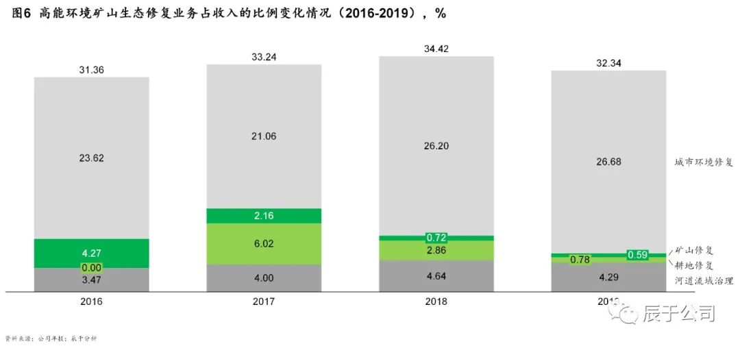 由于市場(chǎng)潛力并未有效釋放,領(lǐng)先的土壤修復(fù)企業(yè)參與這一市場(chǎng)較為謹(jǐn)慎,包括高能環(huán)境、中科鼎實(shí)、建工修復(fù)等龍頭在礦山生態(tài)修復(fù)領(lǐng)域的參與項(xiàng)目很少。以高能環(huán)境為例,近年來(lái)礦山生態(tài)修復(fù)占總收入的比重不升反降,2016年這一數(shù)字為4.27%,2019年則僅為0.59%(見(jiàn)圖6)。