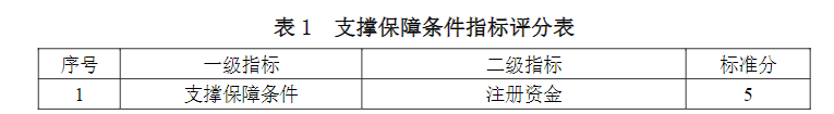 支撐保障條件指標(biāo)包括環(huán)境咨詢(環(huán)保管家)服務(wù)單位的注冊資金、上年度營業(yè)收入、員工數(shù)量、職稱、質(zhì)量管理體系以及業(yè)務(wù)培訓(xùn)6項二級指標(biāo)。支撐保障條件指標(biāo)評分見表1。