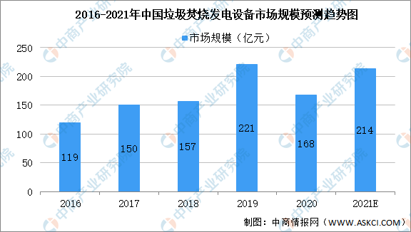 焚燒爐作為垃圾焚燒處理系統(tǒng)最核心的設(shè)備,其設(shè)計(jì)需充分考慮垃圾停留時(shí)間、燃燒溫度、煙氣在爐內(nèi)的停留時(shí)間及紊流等因素,從而達(dá)到完全燃燒、控制惡臭及二惡英類物質(zhì)產(chǎn)生的目的。目前國(guó)內(nèi)外應(yīng)用較多、技術(shù)比較成熟的生活垃圾焚燒爐主要包括流化床焚燒爐、爐排爐型焚燒爐等。2020年,垃圾焚燒發(fā)電設(shè)備市場(chǎng)規(guī)模約為168億元。預(yù)計(jì)2021年我國(guó)垃圾焚燒發(fā)電設(shè)備市場(chǎng)規(guī)模可達(dá)214億元。