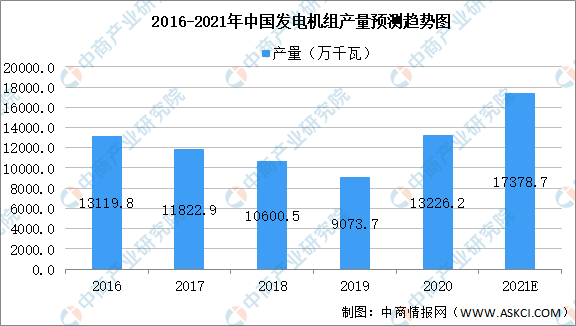 一般我們常見的發(fā)電機(jī)組通常由汽輪機(jī)、水輪機(jī)或內(nèi)燃機(jī)(汽油機(jī)、柴油機(jī)等發(fā)動(dòng)機(jī))驅(qū)動(dòng),可再生新能源包括核能、風(fēng)能、太陽(yáng)能、生物質(zhì)能、海洋能等。數(shù)據(jù)顯示,我國(guó)發(fā)電機(jī)組產(chǎn)量呈波動(dòng)趨勢(shì),2020年我國(guó)發(fā)電機(jī)組產(chǎn)量達(dá)13226.2萬千瓦,預(yù)計(jì)2021年我國(guó)發(fā)電機(jī)組產(chǎn)量可達(dá)17378.7萬千瓦。
