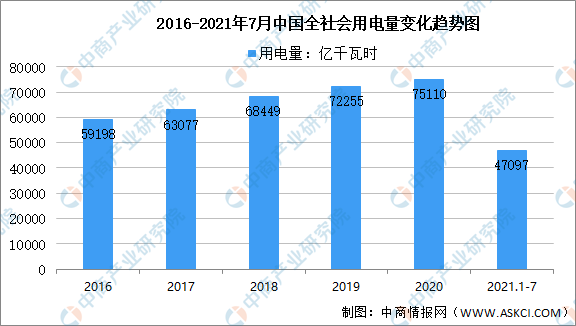 數(shù)據(jù)顯示,去年疫情影響基數(shù)低,2020年全社會(huì)用電量7.51萬億千瓦時(shí),同比增長(zhǎng)3.1%。2021年1-7月,全社會(huì)用電量累計(jì)47097億千瓦時(shí),同比增長(zhǎng)15.6%。