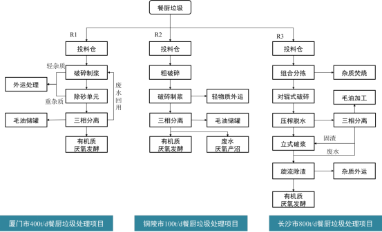 廈門市餐廚垃圾處理項(xiàng)目于2020年開始建設(shè),設(shè)計(jì)處理規(guī)模400t/d,采用“接料粗分+精分制漿+除砂除渣+油水分離”的預(yù)分選技術(shù),分離雜物和油脂后的有機(jī)漿料采用厭氧發(fā)酵進(jìn)行資源化利用。銅陵市餐廚垃圾項(xiàng)目于2020年投入使用,設(shè)計(jì)處理規(guī)模為100t/d,采用“粗破碎+破碎制漿除砂+油水分離”的預(yù)分選技術(shù),分離雜物和油脂后的有機(jī)漿料采用厭氧發(fā)酵進(jìn)行資源化利用。長(zhǎng)沙市餐廚垃圾處理項(xiàng)目于2012年投入使用,并于2018年擴(kuò)建至800t/d處理量,采用“組合分揀+油水分離+制漿”的預(yù)分選技術(shù),分離雜物和油脂后的有機(jī)漿料采用厭氧發(fā)酵進(jìn)行資源化利用。