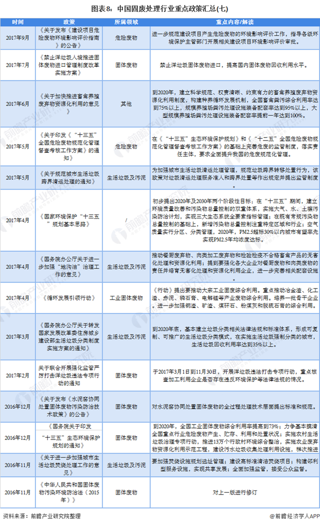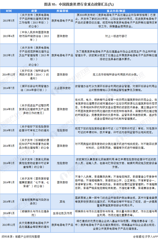 我國固廢行業(yè)相關的重點政策針對方面主要可分為綜合固體廢物、危險廢物、工業(yè)固體廢物、廢棄電器電子產(chǎn)品、生活垃圾及污泥及其他,在該基礎上,針對不同方面出臺了數(shù)量相當?shù)恼咭砸?guī)定和支持固廢處理及其相關產(chǎn)業(yè)(例如,垃圾焚燒發(fā)電等)的產(chǎn)業(yè)化發(fā)展。