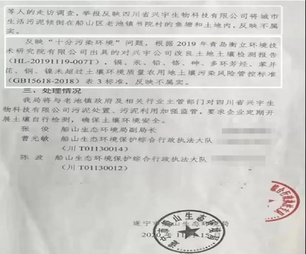遂寧為什么會出現(xiàn)如此嚴重的污泥非法填埋問題?與監(jiān)管失職有關。據(jù)了解,對于新景源環(huán)保的污泥非法處置問題,周邊群眾反映非常強烈。2015年以來,該問題先后被群眾投訴過14次。但是,當?shù)叵嚓P職能部門嚴重失職失責,既不認真調查處理群眾投訴問題,也不按規(guī)定查處新景源環(huán)保的違法行為,導致企業(yè)有恃無恐,問題愈演愈烈。不光是群眾投訴沒人理,就連相關政府部門的投訴也起不到作用。2019年7月,船山區(qū)老池鎮(zhèn)政府曾經(jīng)分別致函船山區(qū)住建、生態(tài)環(huán)境等部門,請求調查處理該企業(yè)違法問題,但相關部門不聞不問,放任問題長期存在。特別是2020年11月,四川省省級生態(tài)環(huán)保督察進駐遂寧市期間,群眾再次投訴該公司非法傾倒填埋污泥問題,但是船山區(qū)卻回復謊稱群眾反映問題不屬實。遂寧市也未經(jīng)認真核實就原樣轉報調查結論,導致問題依然未能得到及時解決。船山區(qū)向省級督察組回復謊稱群眾反映問題不屬實▼