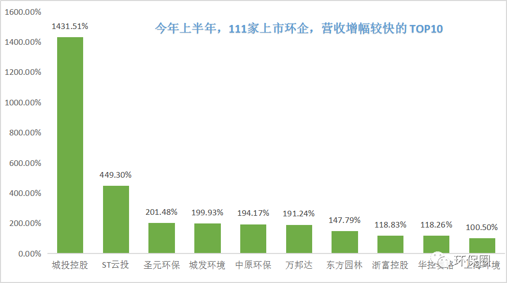 營(yíng)收變動(dòng)幅度方面,數(shù)據(jù)同樣喜人。111家上市環(huán)企,除了那些穩(wěn)步連續(xù)增長(zhǎng)“卓越者”,每年總有一些讓人意想不到的“黑馬”企業(yè)率先突圍出來(lái),少則百分之幾百增長(zhǎng),多則百分之上千增長(zhǎng),成為上半年?duì)I收增速最快的10家先鋒企業(yè)。在半年度營(yíng)收增速TOP10中,既有坐落于上海的房產(chǎn)/水務(wù)/固廢“三劍齊發(fā)”的城投控股以及旗下的上海環(huán)境,也有因納入電價(jià)補(bǔ)貼、部分焚燒項(xiàng)目轉(zhuǎn)運(yùn)營(yíng)推動(dòng)業(yè)績(jī)大增的城發(fā)環(huán)境和圣元環(huán)保,亦有去年業(yè)績(jī)還萎靡不振的萬(wàn)邦達(dá)和東方園林(如圖六所示)。圖六:半年度營(yíng)收增速較快的TOP10榜單▼