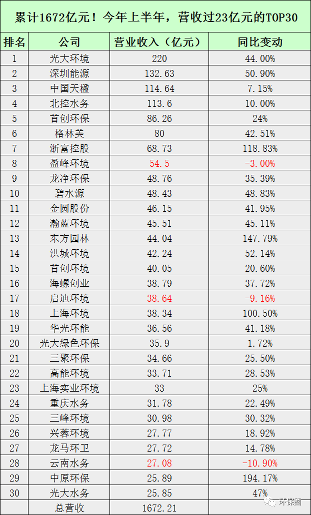 而在半年度營(yíng)收TOP30榜單中,只有啟迪環(huán)境/盈峰環(huán)境/云南水務(wù)略微下降,其余27家均業(yè)績(jī)大喜,30家企業(yè)累計(jì)實(shí)現(xiàn)總營(yíng)收高達(dá)1672億元,這些企業(yè)也掌握著環(huán)保行業(yè)絕大多數(shù)財(cái)富,算是業(yè)內(nèi)較為優(yōu)秀上市企業(yè)(如圖五所示)。圖五:半年度營(yíng)收過(guò)23億元的TOP30榜單圖▼