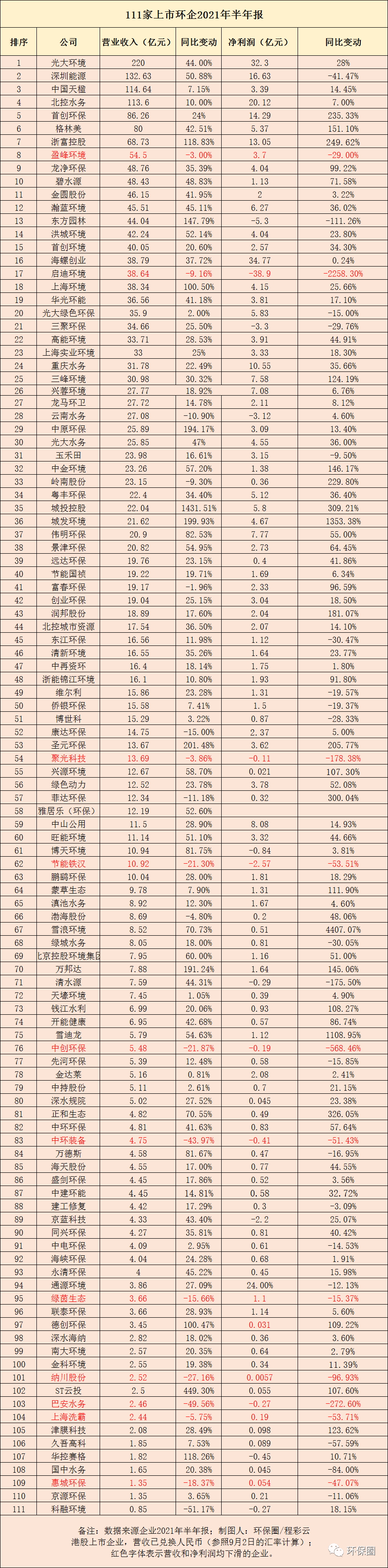 如往常一樣,每年筆者都會(huì)花費(fèi)2周左右時(shí)間統(tǒng)計(jì)制圖,通過(guò)營(yíng)收、營(yíng)收增幅、凈利潤(rùn)、凈利潤(rùn)增幅等幾方面的數(shù)據(jù)維度,為讀者展現(xiàn)每家上市環(huán)企的業(yè)績(jī)?cè)鲩L(zhǎng)情況,以及頭部企業(yè)的變化,從中窺探整體產(chǎn)業(yè)的發(fā)展?fàn)顩r。還記得去年,在統(tǒng)計(jì)百余家上市環(huán)企2020年業(yè)績(jī)時(shí),曾經(jīng)反復(fù)提到到一句話——“疫情影響疊加產(chǎn)業(yè)寒冬余溫,大家普遍過(guò)得都不如從前了,別說(shuō)10%、20%、30%增長(zhǎng),能活下來(lái)都不錯(cuò)了。”這種“王小二過(guò)年,一年不如一年”的形勢(shì),曾經(jīng)導(dǎo)致百余家上市環(huán)企近半數(shù)表現(xiàn)不理想,要么營(yíng)業(yè)收入負(fù)增長(zhǎng),要么歸母凈利潤(rùn)下滑或虧損,其中不乏有排名非??壳暗募?xì)分領(lǐng)域龍頭,如北控水務(wù)、格林美、碧水源、啟迪環(huán)境、東江環(huán)保等,好的不好,差的更差。那么今年上半年呢?環(huán)保企業(yè)是繼續(xù)一蹶不振,業(yè)績(jī)持續(xù)低迷?還是東山再起,打了漂亮翻身仗?總體來(lái)看,今年上半年,111家上市環(huán)保企業(yè)中,營(yíng)收同比增長(zhǎng)的高達(dá)97家,占比87%;歸母凈利潤(rùn)同比增加則有83家,約占75%;營(yíng)收和歸母凈利潤(rùn)“雙增”有75家,約占總數(shù)67%(如圖一圖二所示)。圖一:111家上市環(huán)保企業(yè)2021中報(bào)總體情況▼