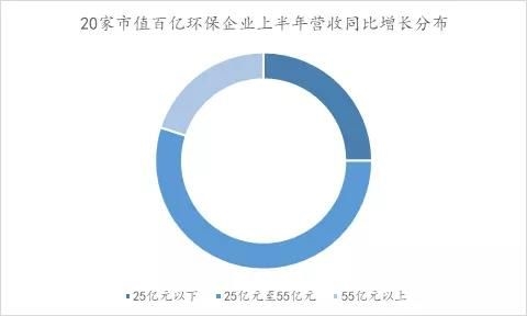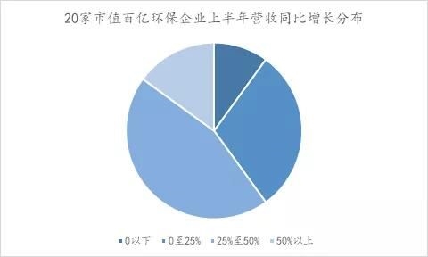 就20家市值百億環(huán)保企業(yè)上半年營收同比增長分布情況來看,增長維持在25%至50%以內(nèi)企業(yè)共9家,占比45%;增長為25%以下企業(yè)共6家,占比30%。