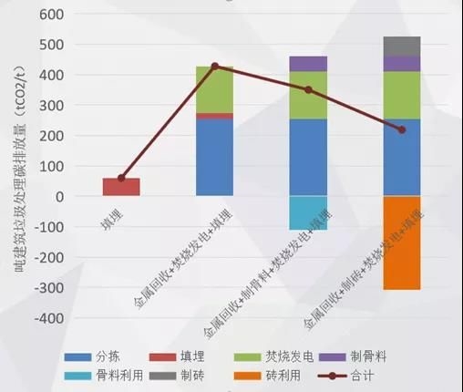 生命周期視角下,不同建筑垃圾處理工藝的碳排放有哪些不同呢?余毅介紹,對(duì)填埋、金屬回收、制骨料、制磚、雜質(zhì)焚燒等工藝組合進(jìn)行生命周期視角的碳排放計(jì)算發(fā)現(xiàn),建筑垃圾填埋碳排放量最低;制磚工藝比制骨料工藝碳排放總量低。