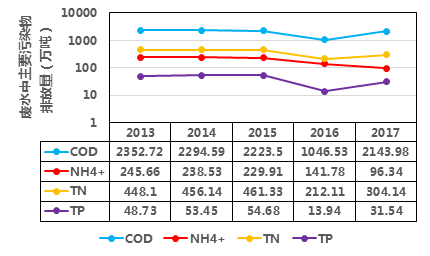 根據(jù)2013-2017年《中國統(tǒng)計(jì)年鑒》,我國廢水排放總量保持在700億噸,其中廢水中COD、氨氮(NH4+)、總氮(TN)、TP排放量如下圖,可見2015年國務(wù)院發(fā)布了《水污染防治行動計(jì)劃》(簡稱“水十條”)后,這幾種污染物排放量得到了削減。