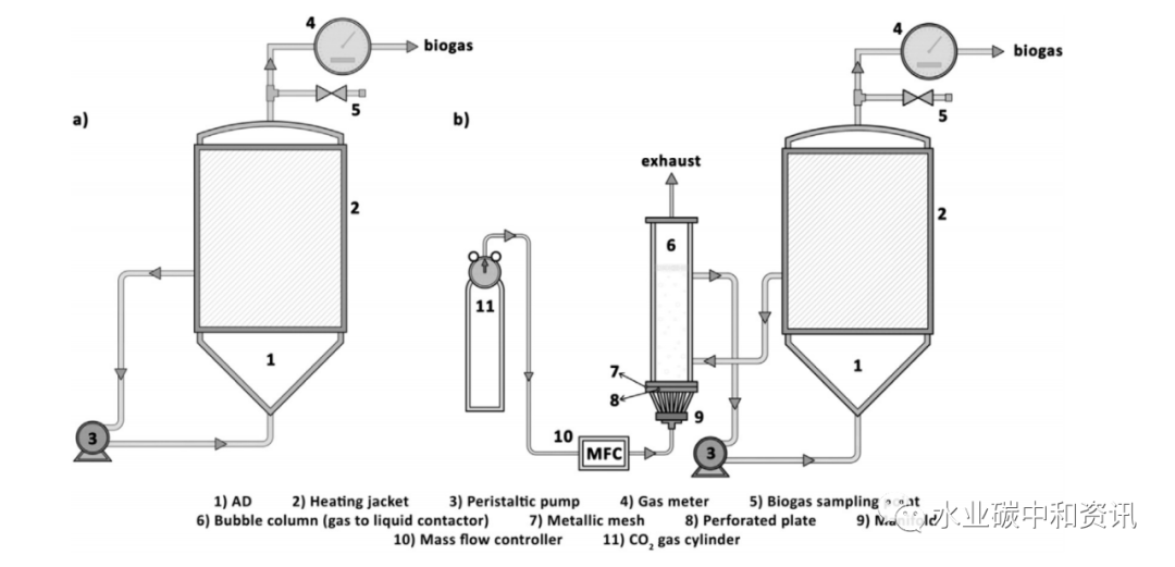 如上所述,剩余污泥與外源固體/液體有機物共消化是實現(xiàn)碳中和的一種潛在途徑。而在厭氧消化中投加CO2也能刺激甲烷產生。一項小試研究證明,向厭氧消化池中投加濃縮有機廢物,適當?shù)靥岣哂袡C負荷及縮短的停留時間,可以提高甲烷產量。因此,市政污水處理廠中可有效應用熱電聯(lián)產,以大大節(jié)省成本(Tandukar and Pavlostathis)。選擇口香糖制造廠和脫水脂肪油脂液產生的工業(yè)廢液作為外部有機物,與剩余污泥(初級﹕二級=40﹕60TS質量比)共消化。結果顯示,沼氣產量明顯增加,剩余污泥額外降解1.1~30.7%。沼氣和甲烷產量都非常接近能夠彌補能量赤字之目標水平。此外,共消化出水水質與只投加剩余污泥控制組相近,說明共消化沒有負面影響。其它有機物與剩余污泥共消化機制相同。一項小試究以牛糞(MN)與外部有機廢物(食品廢物—FW、堿性水解液—AH和粗制甘油—GY)共消化與牛糞單獨消化對比(Usack and Angenent; Regueiro et al.);運行900 d后,4組中溫平行共消化反應器顯示出比甲烷產量(SMY)信息,與GY共消化最適宜總有機負荷率(OLR)為3.2 gVS/L·d(MN : GY = 62:38),最佳SMY為549±25 ml CH4/gVS;FW與AH共消化SMY數(shù)值相近(約300 ml CH4/gVS,對應OLD =3.9 gVS/L·d,MN:FW = 51:49及OLD = 2.7 gVS/L·d,MN:AH=75:25)。眾所周知,CO2是在消化過程中伴隨著甲烷產生的產物。而另一方面,利用厭氧消化進行CO2捕集固定是一種潛力十足的碳減排策略。兩個處理食品垃圾的厭氧消化試驗進行了225 d監(jiān)測,實驗組定期使用氣泡柱充入CO2(Fernandez et al.)。實驗組測試CH4產率為0.56±0.13 m3 CH4/kgVS·d(對照組為0.45±0.05 )沼氣中CH4濃度為68%,額外攝取了外源CO2 0.55 kg,H2濃度增加了2.5 倍,這歸因于CO2溶解以及酸化與產氫途徑改變。