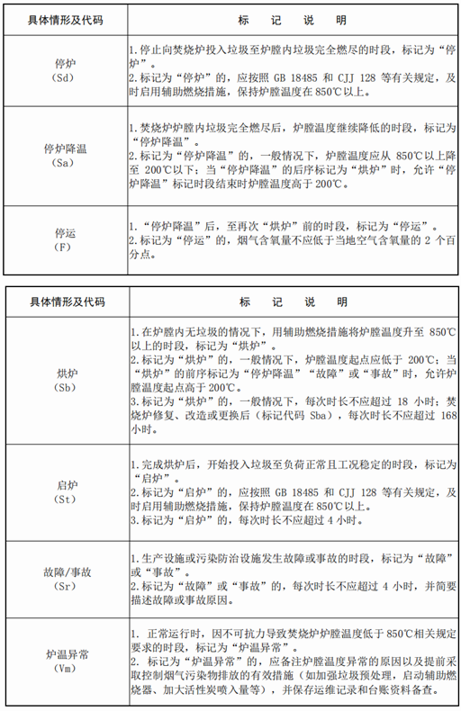 4.3 焚燒爐工況發(fā)生變化時,應按照表 1 及時進行焚燒爐工況標記;未作標記的,焚燒爐視為正常運行。